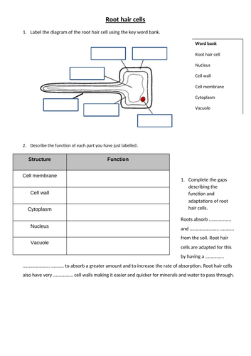 label structure of root cells The shape helps the root hair cell to move around the body, the nucleus helps the root hair cell, the root hair cell is about the same shape as a nerve cell Root hairs are long tubular out growths made of root epidermis cells that form to increase the root surface Root hair development consists of root hair initiation and tip growthRoot hair cells The root hairs are where most water absorption happens They are long and thin so they can penetrate between soil particles and they have